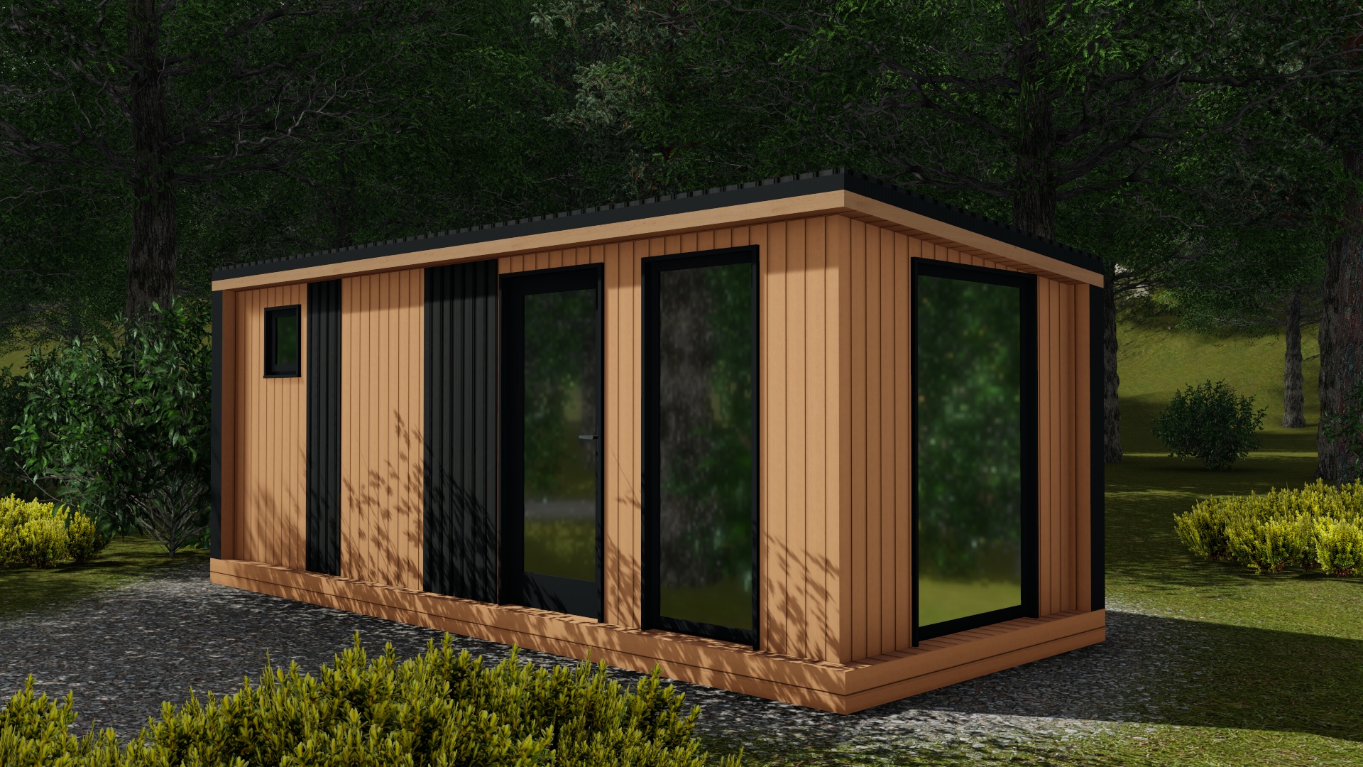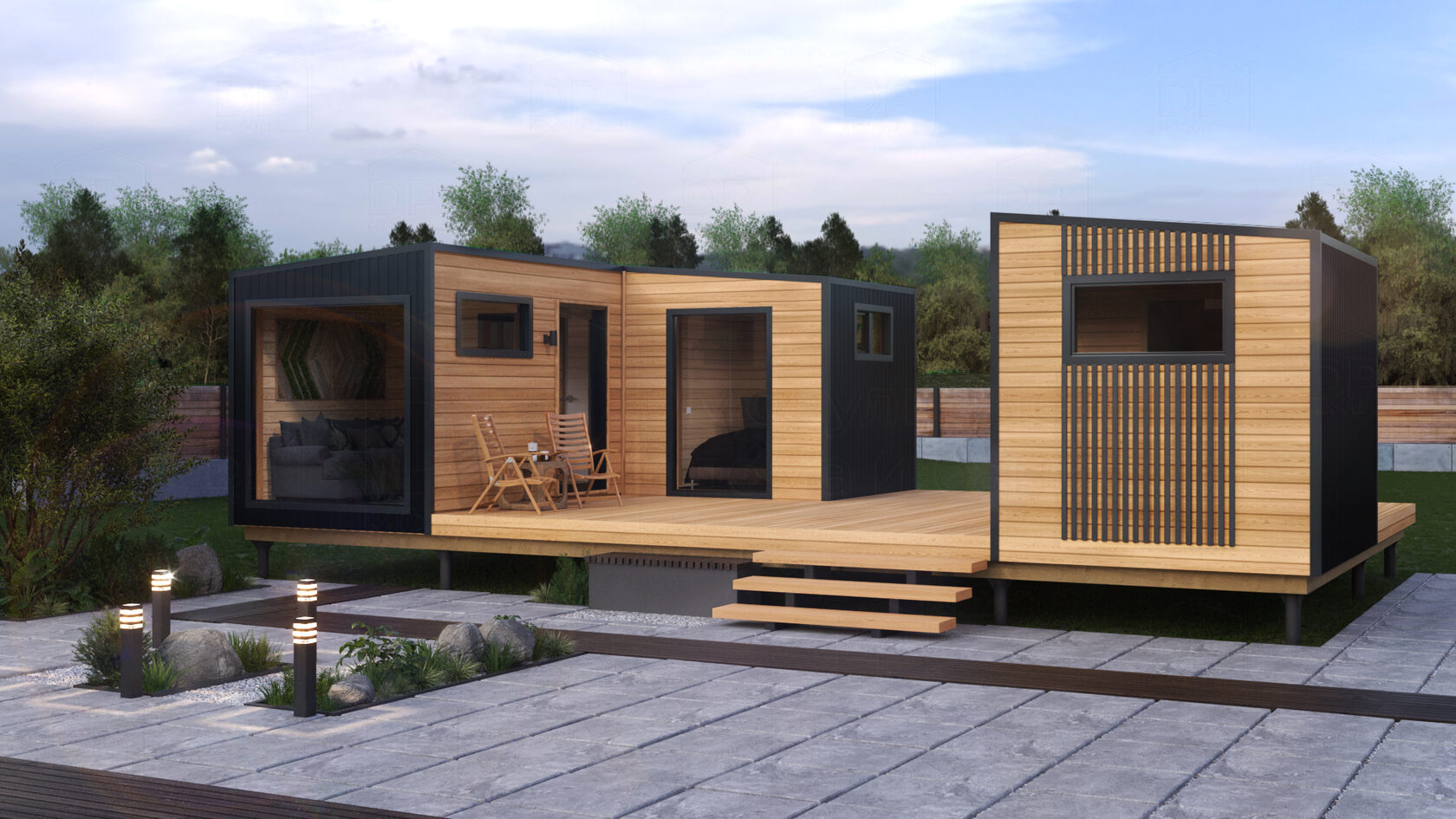 - Фундамент, каркас из сухой древесины, наружная отделка (имитация бруса/профлист), мягкая кровля.